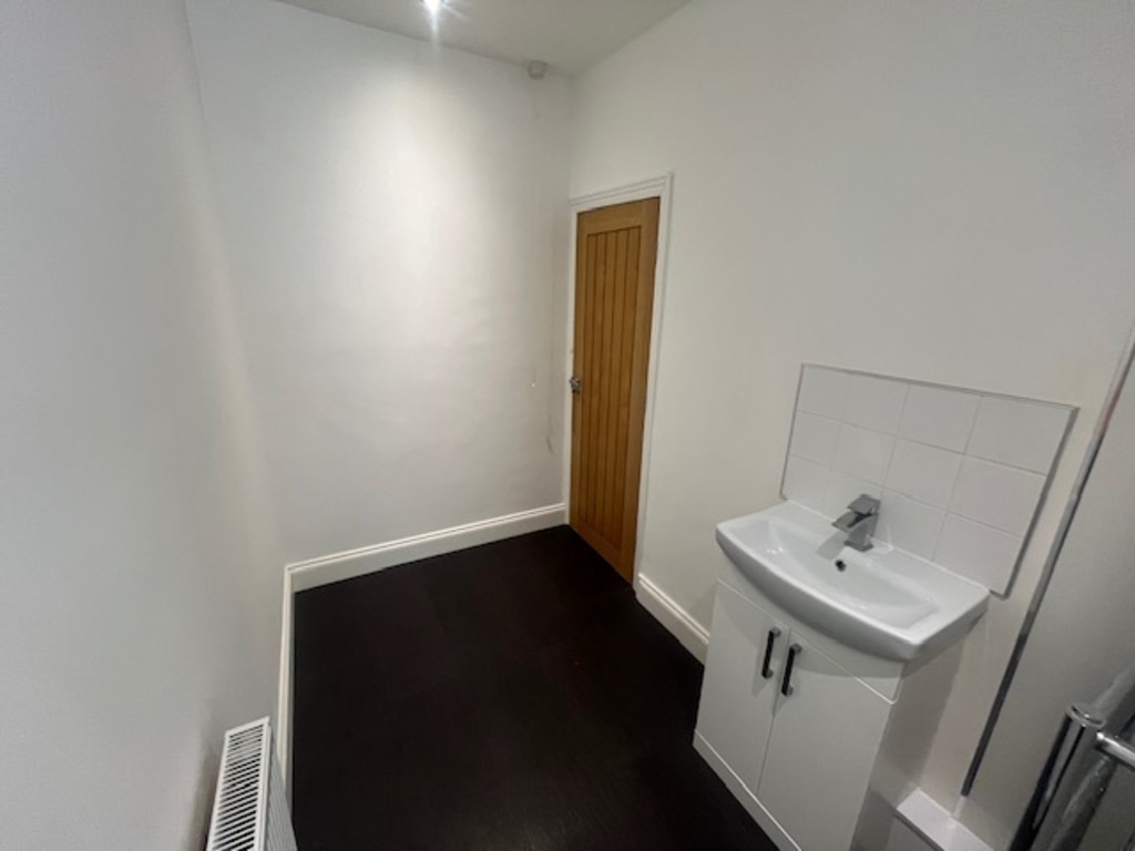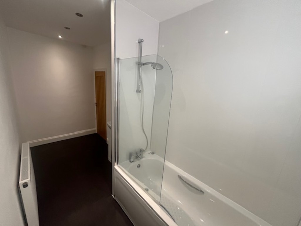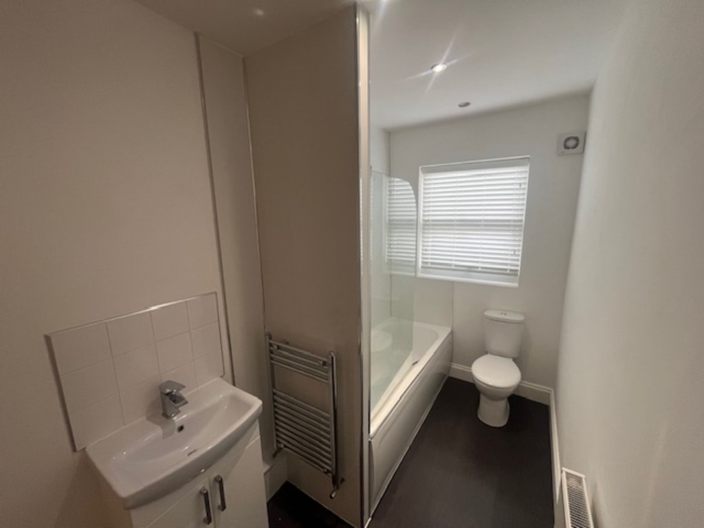 BATHROOM Rear facing obscure window with three piece suite in white, vanity style sink unit with over bath mains shower and screen, chrome towel rail, central heating radiator and laminate flooring.