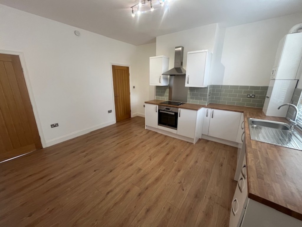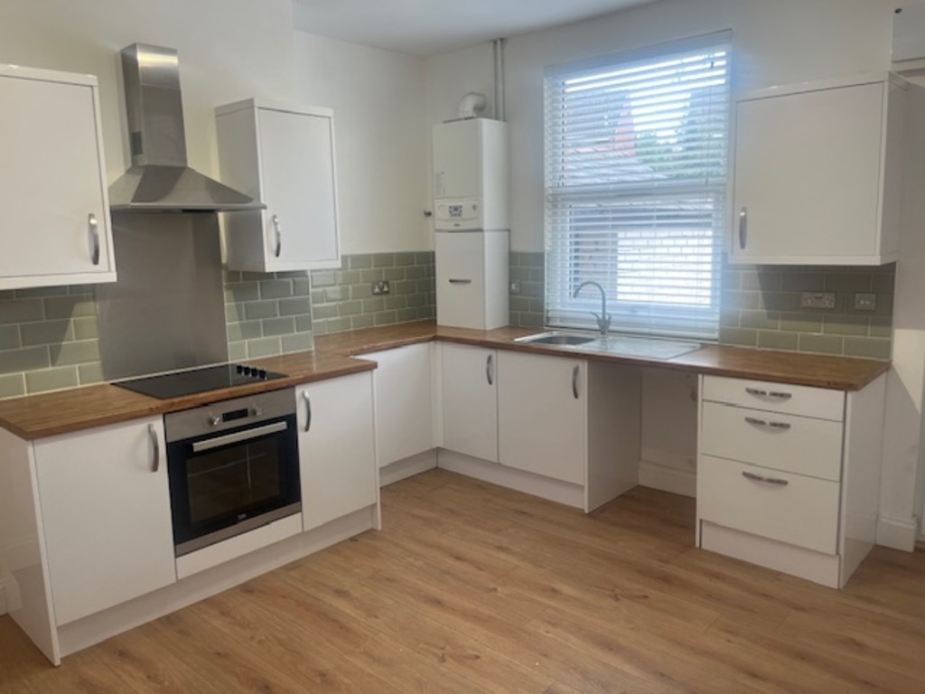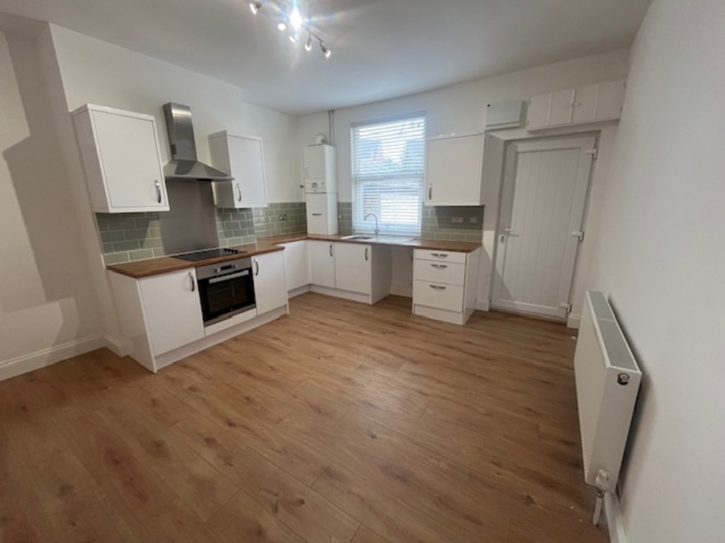 KITCHEN/DINER 13' 01" x 13' 06" (3.99m x 4.11m) Rear facing window with entrance door, a range of wall and base units incorporating a stainless steel sink with mixer tap, tiled splashbacks with built under electric oven and hob with extractor fan over , chrome splash back, plumbing for washing machine, space for fridge freezer, under stair storage cupboard, central heating radiator and laminate flooring.