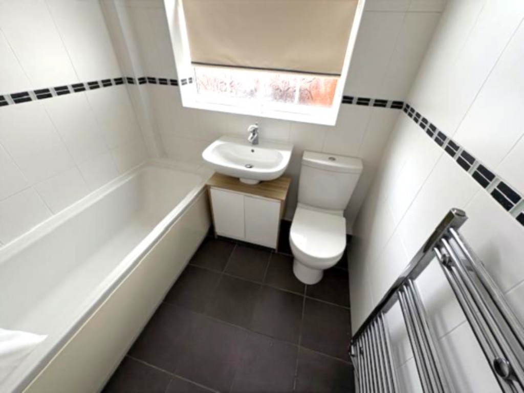 BATHROOM Side facing window, bathroom suite in white with vanity sink unit with low flush W/C. Heated chrome towel rail, tiled flooring and above bath shower.