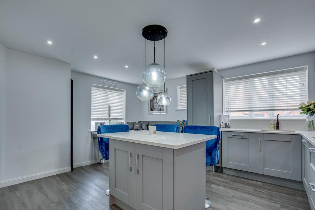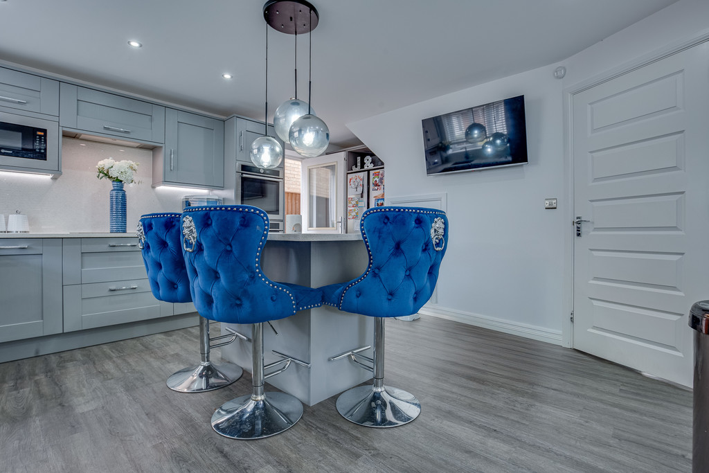 KITCHEN/DINER The kitchen has a front facing window with a range of wall and base units incorporating a carbon fibre sink with mixer tap in gun metal grey. two electric ovens with induction hob and extractor fan over, integrated dish washer, washer and space for fridge freezer, island, built in dining area with storage karndean flooring in grey with central heating radiator.
