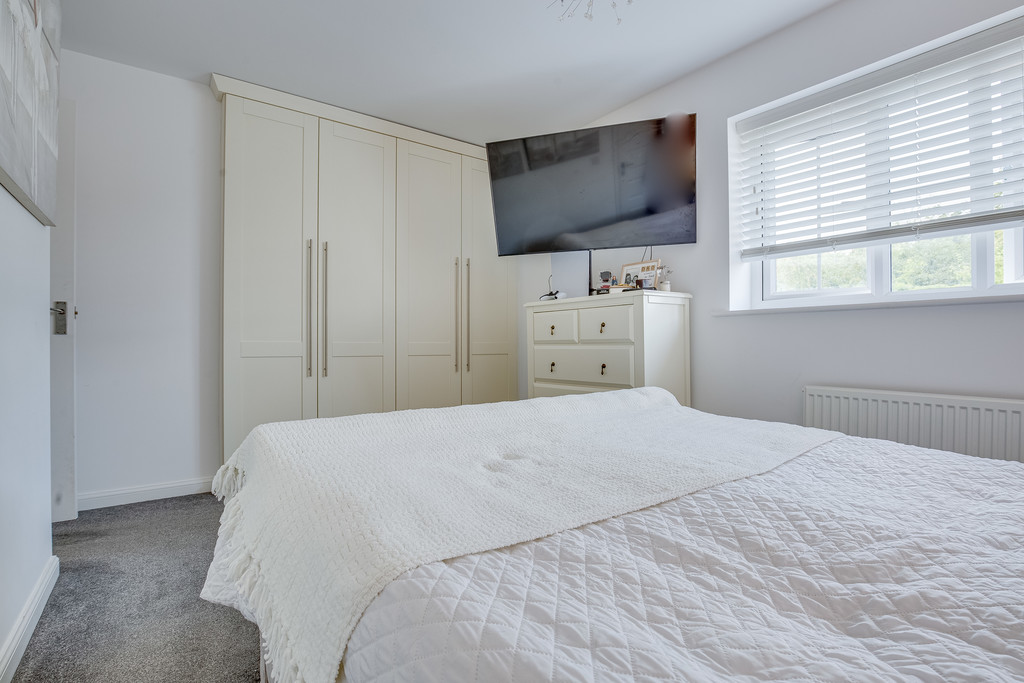 MASTER BEDROOM Front facing window with built in bedroom furniture with carpets laid to flooring and central heating radiator.
