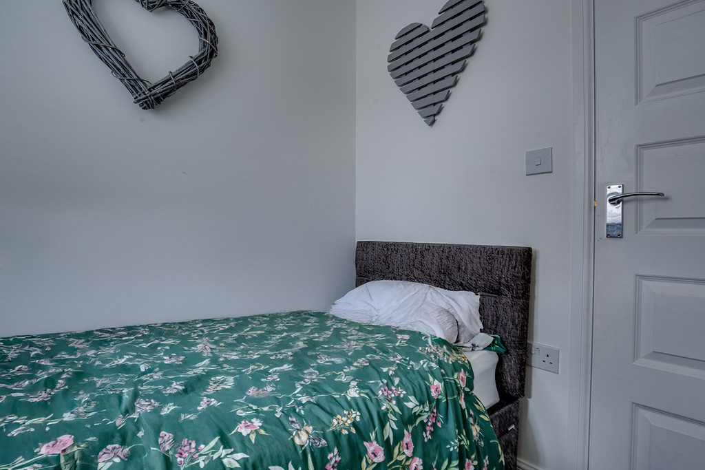 BEDROOM THREE Side facing window with built in wardrobes and central heating radiator.