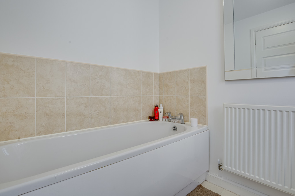 BATHROOM Having side facing window with three piece suite in white, partially tiled with central heating radiator.