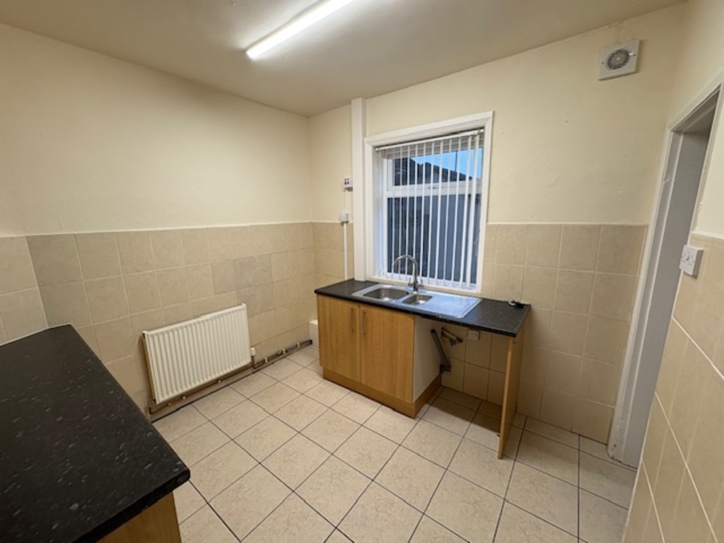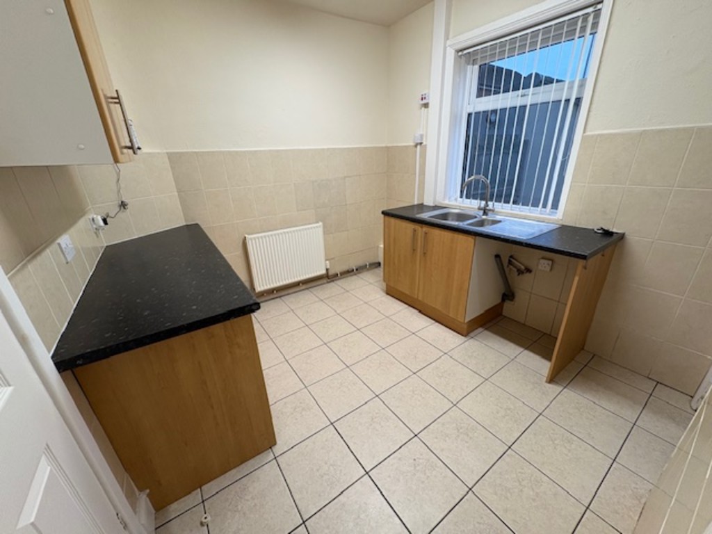 KITCHEN 9' 0" x 8' 07" (2.74m x 2.62m) Rear facing window with range of wall and base units incorporating a stainless steel sink with mixer tap, plumbing for washing machine space for fridge freezer, space for free standing oven, tiled flooring and Partially tiled walls with central heating radiator.