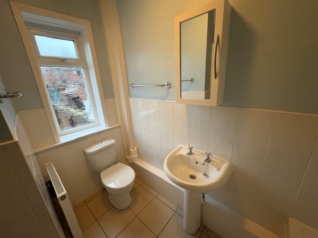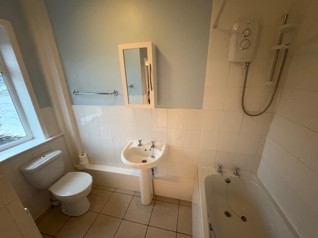BATHROOM Rear facing window with three-piece suite in white with over bath electric shower, tiled flooring and central heating radiator.