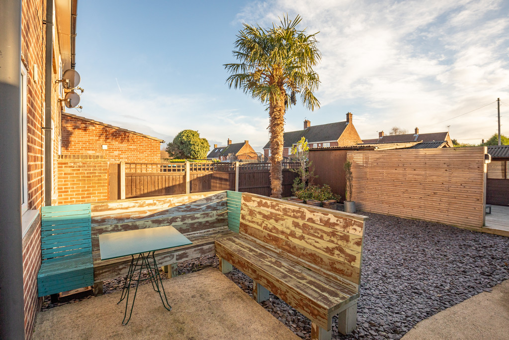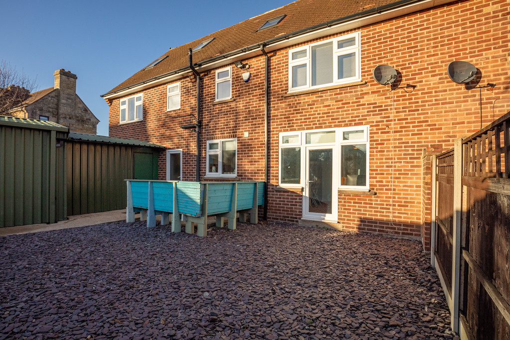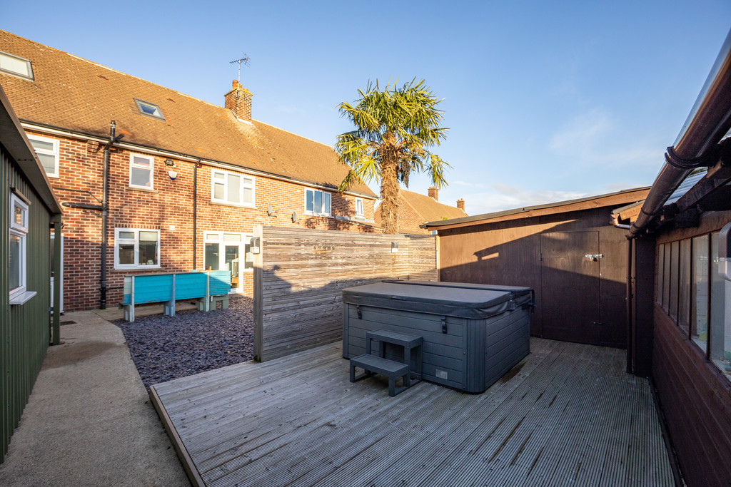 REAR GARDEN 481 sq.ft (44.7 sqm) approx Good Sized Low Maintenance Garden With Hot Tub; Seating Area; Summer House and Three Timber Storage Sheds; Ample Space to Add A Conservatory.