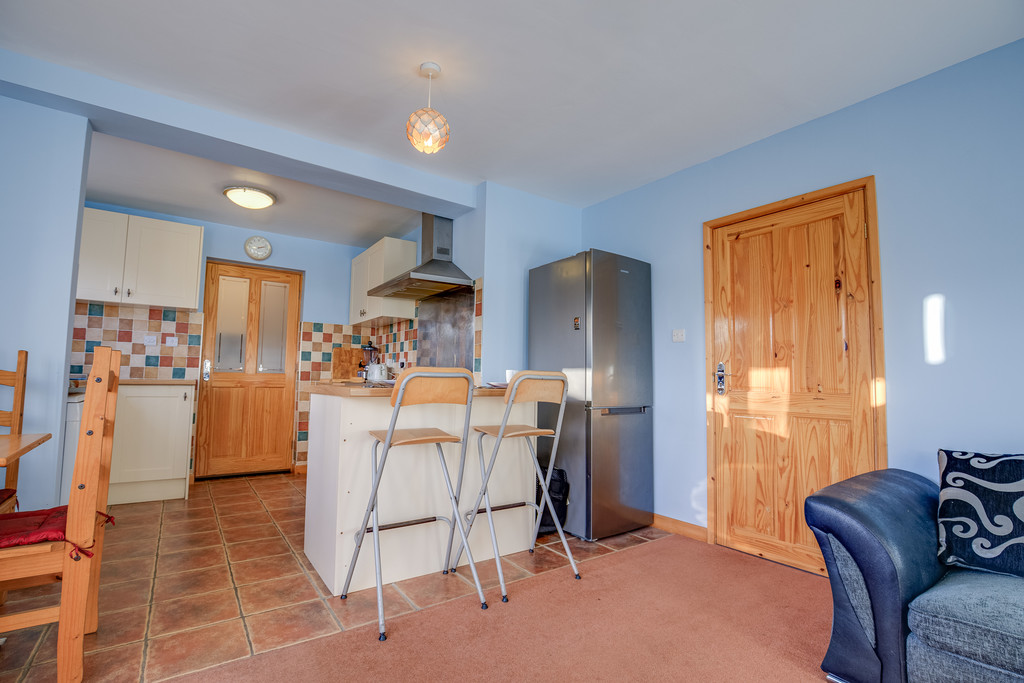 L SHAPED OPEN PLAN KITCHEN & LIVING AREA 20' 4" x 12' 4" (6.20m x 3.78m) to maximum lengths Kitchen Area:A Comprehensive Range Of Base And Wall Mounted Units; Tiled Splash Backs; Stainless Steel Sink And Draner; Space For Arga Style Cooker; Illuminated Extractor Fan Over; Space And Plumbing For Dishwasher; Tiled Floor And Rear Facing Window. Living Area: With Rear Facing External Door And Windows; An Open Log Fire With Fire Surround.
